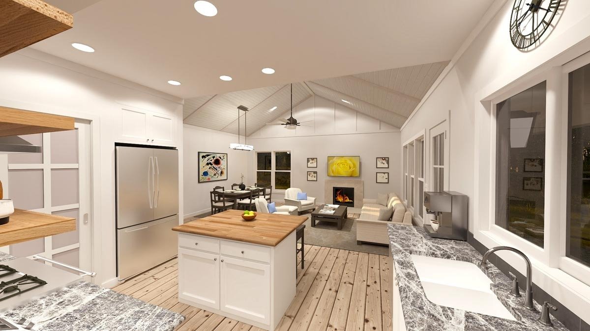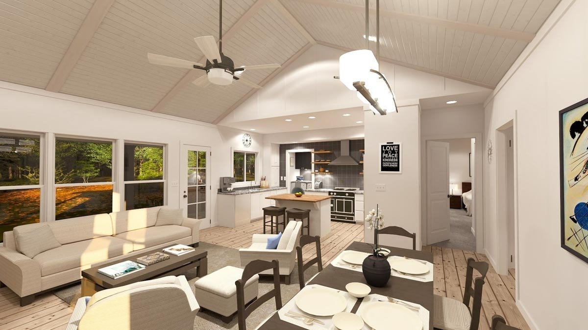 - The living, dining and kitchen areas are all combined into one vaulted space with access to the back porch.