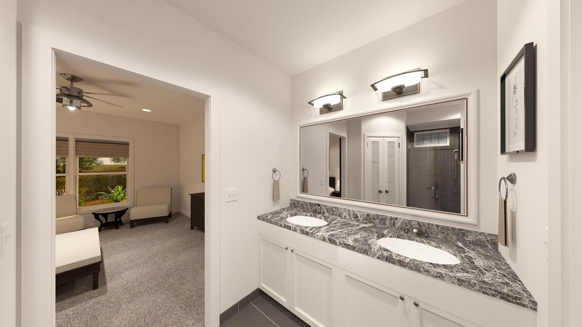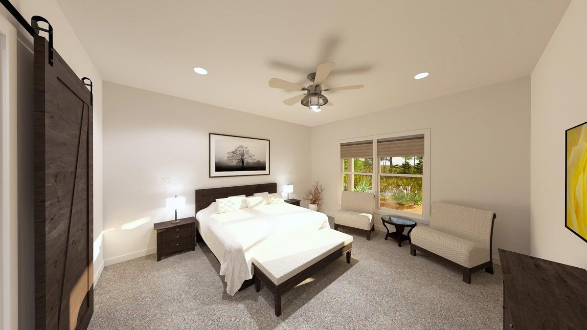 - A split bedroom layout maximizes your privacy. The master suite is equipped with two separate “his and hers” walk-in closets, a barn door that opens to the bathroom and provides convenient access to the laundry room.