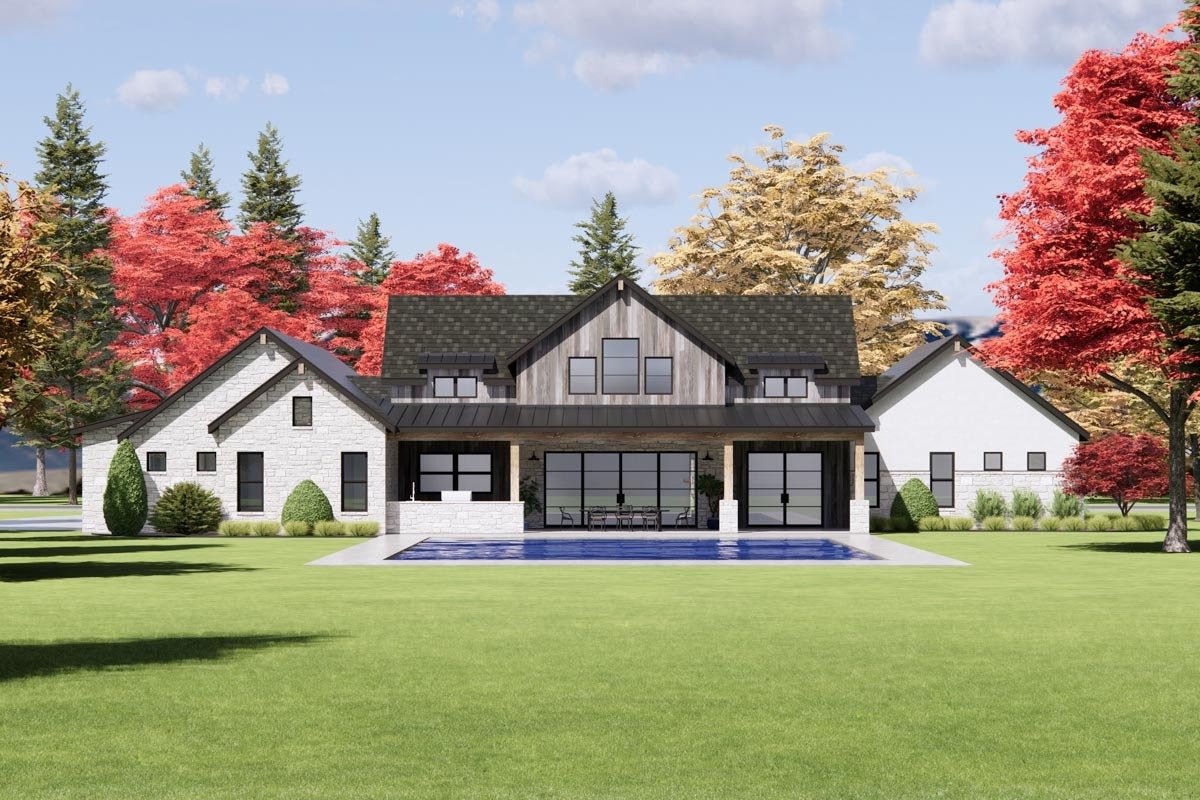 - Three bedroom suites consume the left side of the layout, along with a game room that overlooks the 15’7″-deep rear porch.